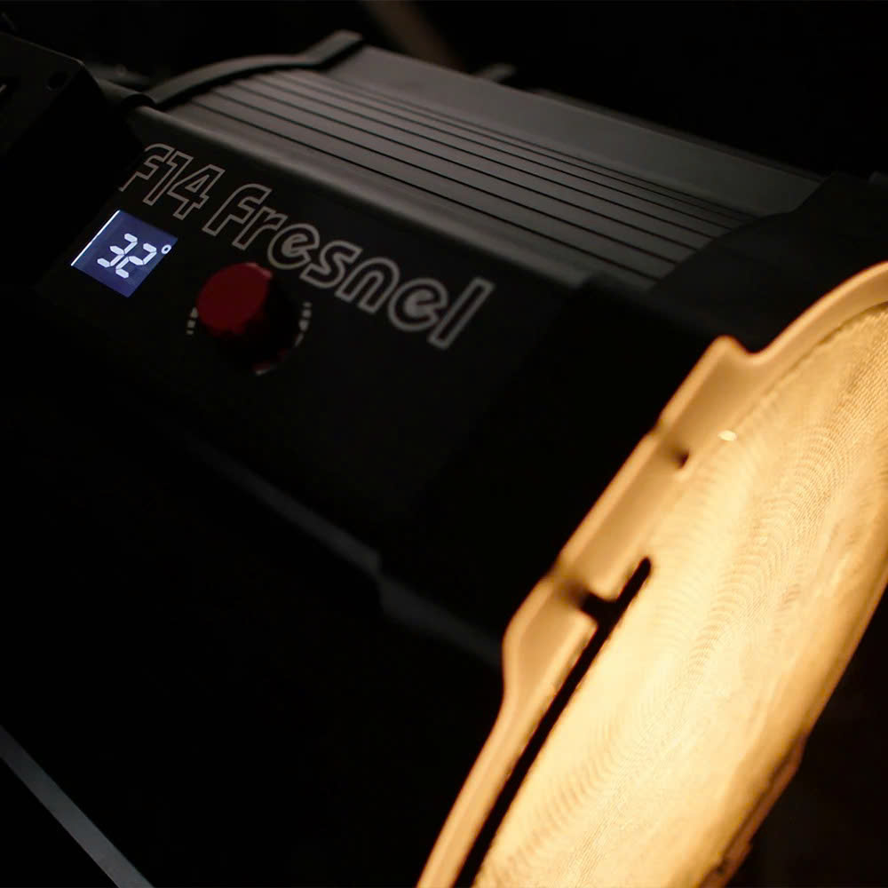 - Thấu kính Aputure F14 Fresnel có đường kính 14″ và phạm vi góc chùm tia từ 18° đến 45° được cơ giới hóa (điểm đến ngập) dành cho các thiết bị có nguồn điểm A-Mount công suất lớn